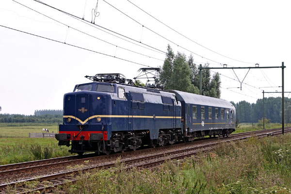 Houten, 12 augustus 2007. Loc 1202 brengt slaaprijtuig 4750 (NS 61847271320-4) over naar het Spoorwegmuseum. Het is de bedoeling dat dit rijtuig (type MUs, bouwjaar 1964) zijn oorspronkelijke Wagon-Lits-uiterlijk terugkrijgt. Foto Rob van der Woude. |