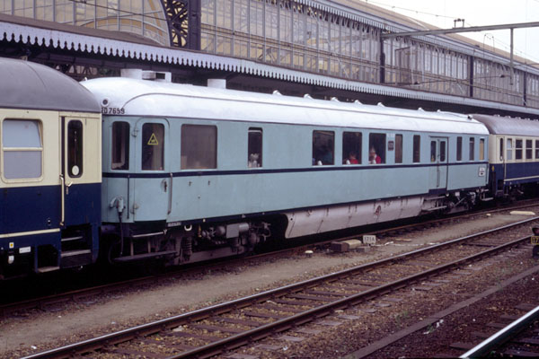 Den Bosch, 20 mei 1991. Restauratierijtuig RD7659, een Plan D uit 1951. De turkooise kleur hebben de rijtuigen en de e-locs in de jaren vijftig maar kort gehad. Het rijtuig was in bezit van de SSN, maar bevindt zich nu in de oude blauwe uitvoering in de collectie van het Spoorwegmuseum. |