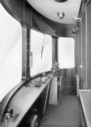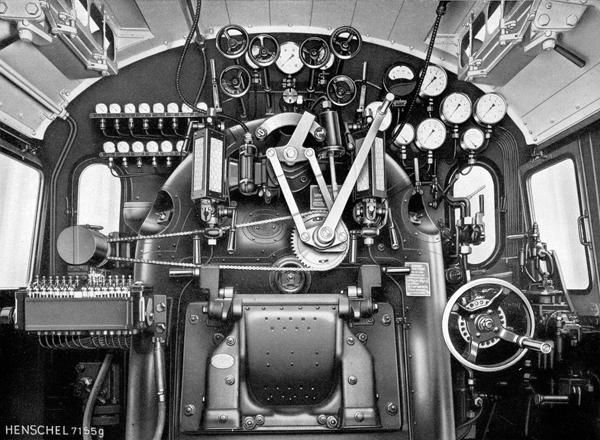 Machinistenhuis van een KBE-loc. De regulateur kan door middel van een elektromotor en ketting op afstand worden geopend. Het sluiten van de regulateur gebeurt door een luchtdrukcilinder; dit gebeurt automatisch zodra de loc tot stilstand wordt gebracht. Het ganghendel (het grote wiel rechts) wordt, als de machinist niet op de loc aanwezig is, bediend door de stoker. |