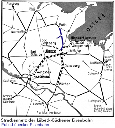 Hiernaast een netkaartje van de Lübeck-Büchener Eisenbahn (LBE), jaren dertig. Hierop vond een druk verkeer plaats. Om dat zo snel mogelijk af te wikkelen, liet de LBE dubbeldeksrijtuigen bouwen die als trek-duwtrein werden ingezet. Men liet hiervoor gestroomlijnde locomotieven bouwen. De eerste twee locomotieven, LBE 1 en 2, bleken iets te zwak om met twee rijtuigstammen te rijden. De derde loc, LBE 3, was daarom iets sterker uitgevoerd. De locs zijn in 1936/37 gebouwd door Henschel. In 1938 zijn ze als Baureihe 60 in het nummersysteem van de Reichsbahn opgenomen. Twee locs overleefden de oorlog en hebben nog enige jaren dienstgedaan in de DDR. Behalve deze drie locs had de LBE onder andere vijf locs van de Baureihe 74. Die waren eveneens gestroomlijnd. De stroomlijn bleek overigens een verwaarloosbaar voordeel te hebben bij de gereden snelheden (120 km/uur), maar het zag er natuurlijk wel erg modern uit. Eutin-Lübecker Eisenbahn (ELE)Op het kaartje heb ik de lijnen van de Eutin-Lübecker Eisenbahn (ELE) blauw gemaakt. De ELE en LBE werkten samen; ze deelden het station van Lübeck en een deel van de spoorlijn ten noorden daarvan. Net als de LBE is de ELE opgegaan in de Reichsbahn. |