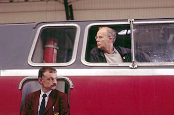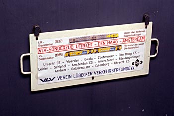 Op het bord staat, behalve de route die de trein zal afleggen, een afbeelding van de LBE-dubbeldekker uit 1937 en een afbeelding van een NS-dubbeldekker uit 1985. Op de loc doen een Duitse machinist en een Nederlandse pilot dienst. |