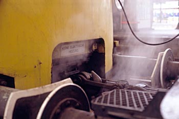 Op het bord boven de koppeling staat "Keine elektrische Heizung". Dat is geen probleem, want de loc heeft een stoomketel aan boord die voor de treinverwarming kan zorgen. |