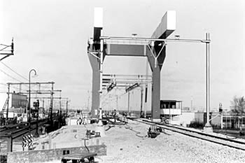 In de tweede helft van de jaren zestig werd het oude stationsgebouw vervangen door nieuwbouw, maar de sporensituatie veranderde nauwelijks, met uitzondering van het voorgaande. Het klassieke armseinstelsel (blokstelsel III) werd al eerder vervangen door moderne daglichtseinen en Weesp kreeg stationsrelaisbeveiliging met een AR-bedieningssysteem. Dit systeem kwam in dienst op 11 mei 1959 (zie ook de artikelen over Hilversum en Bussum in het kader van de modernisering van de Gooilijn in vorige bulletins) en ging buiten dienst op 1 juni 1986. Weesp werd daarna bediend door post T te Amsterdam via een NX-toestel, later door Integra en nog weer later via procesleiding (met EBP, Elektronische Bedien Post). Spoorwegongevallen in WeespTwee ernstige spoorwegongevallen in de spoorweghistorie van Weesp zijn het vermelden waard. Op vrijdag 13 september 1918 vond er bij de brug over het Merwedekanaal (later Amsterdam-Rijnkanaal genoemd) een spoorwegongeval plaats van voor Nederland tot dan toe ongekende orde. Toen trein 102 ’s ochtends om ongeveer 10.30 uur met een snelheid van 55 à 60 km/uur de helling naar de brug op reed, voelde het locomotiefpersoneel op zo’n 30 meter van de brug dat de machine plotseling wegzakte en naar rechts overhelde. Dit gebeurde ter hoogte van blokpost CB bij de brug. Het spoorbaantalud was over een lengte van ongeveer 95 meter volledig verzakt en weggeslagen. Trein 102 stortte in zijn geheel van de spoordijk. In totaal waren bij deze ramp 41 doden en 42 gewonden te betreuren. De commissie van onderzoek kwam tot de conclusie dat de spoordijk was bezweken door het doorweekte zandpakket als gevolg van zware regenval (in de tien dagen ervoor maar liefst 100 mm regen) in combinatie met een uitzonderlijk hoge waterstand in het Merwedekanaal, kwelwater en een hoog grondwaterpeil. Bij het passeren van de trein raakte de zandmassa in trilling, waardoor de kering op de zwakste plaats bezweek en afschoof. Het doorweekte gedeelte van de baan was in beweging gekomen en uiteindelijk ingestort. Dit ongeval heeft geleid tot betere inzichten in de grondmechanica. Op 19 juni 1953 kwam in de ochtendspits een abrupt einde aan de vrijwel nieuwe e-loc 1303, die met exprestrein 21 van Amsterdam op weg was naar Enschede en achterop de bijna stilstaande forensentrein 825 reed die naar Naarden-Bussum onderweg was. Deze trein bestond uit twee vierwagentreinstellen Mat’46, het achterste treinstel 642, waarvan de achterste rijtuigbak geheel vernield werd. De locomotiefbak van de 1303 schoot van de spoordijk af en kwam tot stilstand in de sloot naast de dijk. De voorste twee rijtuigen van de exprestrein ontspoorden en het eerste rijtuig kwam dwars over de baan te staan. Bij dit ongeval kwamen twee mensen om het leven en raakten 8 reizigers gewond.
