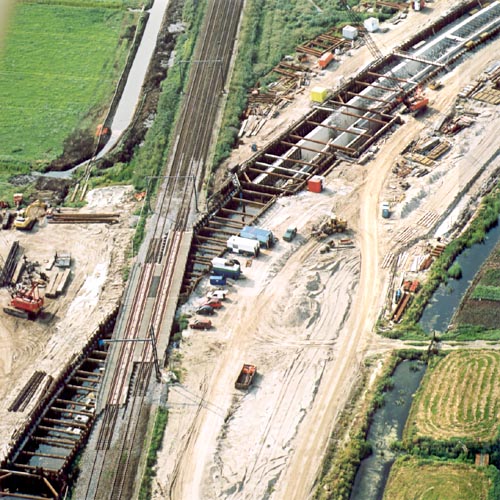 Viersporigheid Weesp – GaasperdammerwegMet de ingebruikname van het nieuwe Weesp blijft het tracé tussen Weesp en de Gaasperdammerweg aanvankelijk tweesporig. Na de ingebruikname van de Zuidtak (de spoorlijn via Diemen-Zuid, Duivendrecht RAI naar Schiphol) op 21 mei 1993 wordt de baanvakbelasting over de twee sporen tussen Weesp en de brug over het Amsterdam-Rijnkanaal zo groot, dat er behoefte ontstaat aan capaciteitsuitbreiding. In 1994-1996 wordt het tracé viersporig gemaakt; dit kwam vanaf 7 juli 1997 volledig in dienst. Dit betekende ook de verdubbeling van de spoorbrug. De splitsing ligt even ten noordwesten van de brug en staat bekend als Gaasperdammerweg Aansluiting (Gpda; baanvak Amsterdam-Amersfoort kilometrering 9.789/baanvak Gpda-Schiphol km 145.800), genoemd naar de (dam in de) Gaasperplas ten zuiden van Diemen. Met fly-overs wordt het andere treinverkeer gekruist. Er liggen hogesnelheidswissels zodat de ter plaatse geldende baanvaksnelheid van 130 km/uur aangehouden kan worden, op de fly-overs lager. Door de viersporigheid ontstaan nu gelijktijdige, onafhankelijke treinbewegingen per richting (naar/van Schiphol, resp. Amsterdam CS). De bediening van dit complex vindt plaats vanuit de procesleidingspost Amsterdam (bediengebied treindienstleider Weesp/Zuidtak). De spoorbruggen over het Amsterdam-RijnkanaalIn 1972 werd een verstijfde staafboogbrug aangelegd met een hoofdoverspanning van 188 meter en een doorgaande vakwerkverstijvingsligger als zogenaamde V-ligger ter vervanging van de oude brug. Hierdoor kon ook het kanaal zelf verbreed worden wat nodig geacht werd in verband met de drukker wordende scheepvaart. Deze brug werd nog grotendeels geklonken.