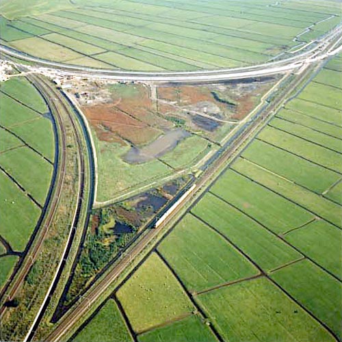 Muiderberg, 5 juli 2016. De nieuwe spoorbrug over de A1, gezien vanuit de lucht. Het zijn twee foto’s die exact 180 graden van elkaar verschillen, zodanig dat de beide aanzichten van de brug precies over elkaar heenvallen. Alleen de omgeving en achtergrond veranderen. Over de brug, de Zandhazenbrug, loopt de spoorlijn van Weesp naar Almere. Fotografie Henk Koster. |