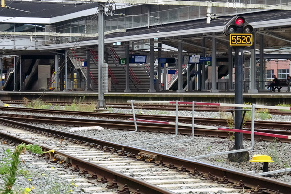 Amersfoort, 2 augustus 2025. Treinen die van de PON-lijn uit Leusden komen, komen bij station Amersfoort sein 5520 tegen. Officieel mag je dit geen dwergsein noemen maar een 'laaggeplaatst lichtsein', hoewel het niet echt laaggeplaatst is. Maar de betekenis is duidelijk: bij groen licht mag hier maximaal 40 km/uur worden gereden. Het sein heeft geen voorsein. In plaats hiervan worden keperbaken gebruikt: drie rechtopstaande borden die ongeveer 60 meter van elkaar vandaan staan. De betekenis is: snelheid verminderen zodat je op tijd kunt stoppen als het sein rood is. De overweg die je op deze foto's ziet is in de Utrechtseweg, zo'n 500 meter voor het station. |