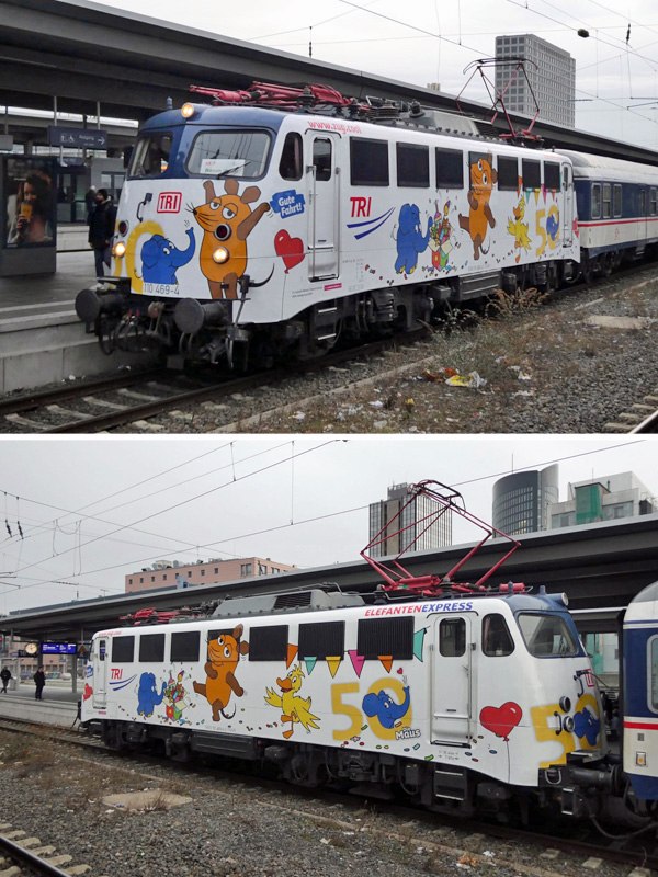 Dortmund, 20 februari 2025. Loc 110 469 met de Elefanten-Express. Hiermee wordt aandacht besteed aan de vijftigste verjaardag van de kleine blauwe olifant uit de "Sendung mit der Maus", een soort Sesamstraat. Foto's Jan de Kroon. |