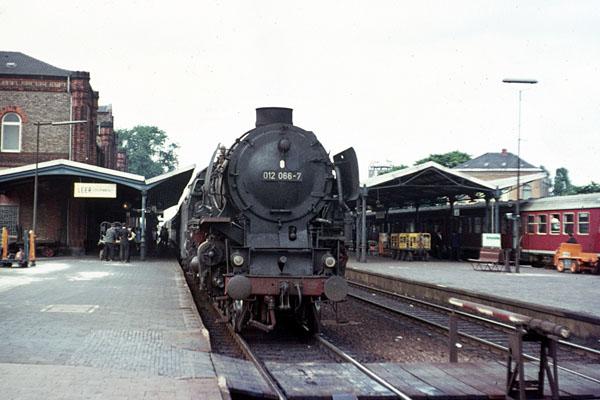 Leer, 13 april 1974. Loc 012 066 is met trein D735 onderweg van Norddeich-Mole naar Rheine. Op het perron staat het bandrecordertje van Rob van der Rest. Foto Jan van Barneveld, collectie Rob van der Rest. |