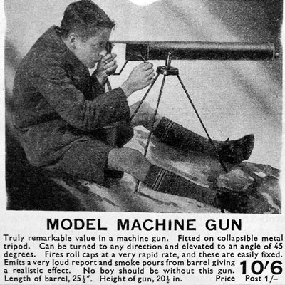 Meccano leverde niet alleen pedagogisch verantwoorde bouwdozen, treinen en scheikundesets, maar ook speelgoed zoals dit machinegeweer. Leuk om cadeau te doen met de kerst. Bron: Meccano Magazine, 1934. |