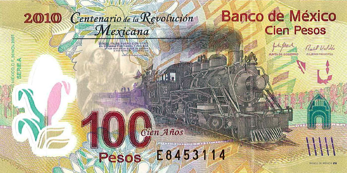 Bankbiljet, uitgegeven in 2010 ter gelegenheid van de Mexicaanse Revolutie die honderd jaar daarvoor begon. Op het biljet van 100 Pesos (iets meer dan 5 euro) is locomotief 279 afgebeeld, een 2-8-0 smalspoorlocomotief die een rol bij de revolutie heeft gespeeld. Deze loc is thans te bezichtigen in een spoorwegmuseum te Cuautla (ten zuidwesten van Mexico City) en is bedrijfsvaardig. De loc heeft ook een rol gespeeld in de film 'Bandidos'. Collectie Gérard van Teeffelen.