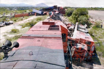 Drie locomotieven en achttien wagons werden vernield bij een treinbotsing zaterdag in Mexico. Zeven mensen kwamen hierbij om. De trein was op weg van Guadalajara naar Mexico City. Metro, 28 juni 2004. Foto Luis Soriano/EPA. |