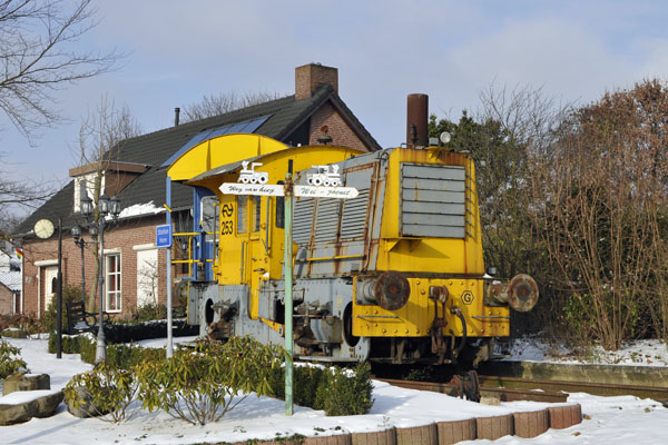 Horn, 24 januari 2013. Sik 253 met daarachter een spoorwagen langs het perron van 'Station Horn'. Dit station is onder andere voorzien van een zitbank, een stationsklok, een lantaarn en uiteraard een bord met de stationsnaam. Het locje is sinds 2003 eigendom van Vermeulen Landschapsverzorging aan de Posthuisweg. Foto Rob Quaedvlieg. |