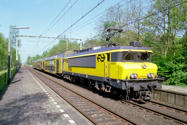 Soestduinen, 8 mei 1998. Loc 1706 vertrekt met een dubbeldekker naar Utrecht. |