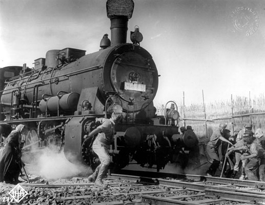 Stills uit een UFA-film, waarschijnlijk gemaakt voor de Tweede Wereldoorlog. Stoere Duitse mannen voeren een gevaarlijke operatie uit rond een Chinese trein. Dat wil zeggen, het is een volbloed Pruisische locomotief (G10, Baureihe 57.1) waar wat Chinese tekens op zijn geschilderd. Een eenvoudige vonkenvanger op de schoorsteen zorgt voor de finishing touch. De foto's zijn goedgekeurd door de Nederlandse Rijksfilmkeuring. Foto's collectie Nico Spilt. |