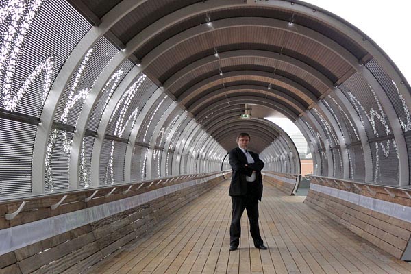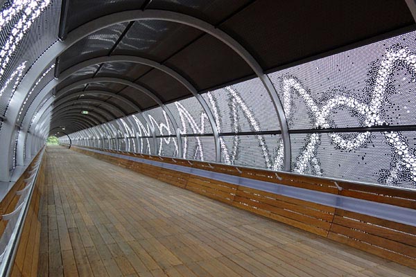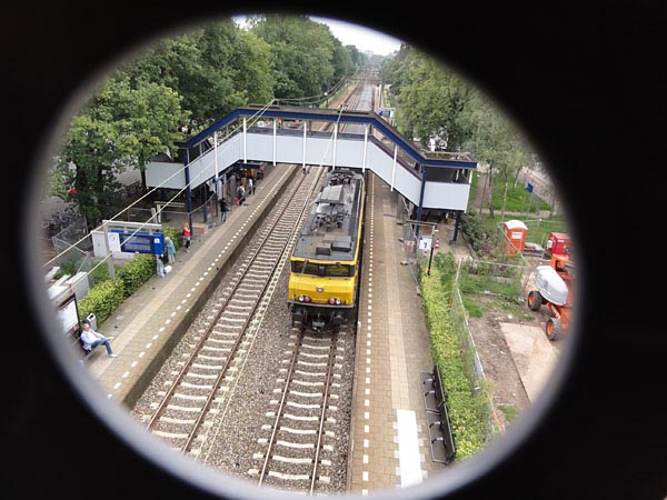 Hilversum Noord, 6 augustus 2011. De nieuwe traverse is in gebruik genomen en de oude luchtbrug staat op het punt te worden gesloopt. Wie met een grote camera rondloopt heeft een probleem, maar met kleinere toestellen valt goed door de gaten van de traverse heen te fotograferen. Camera: Sony Cybershot DSC-HX5. |