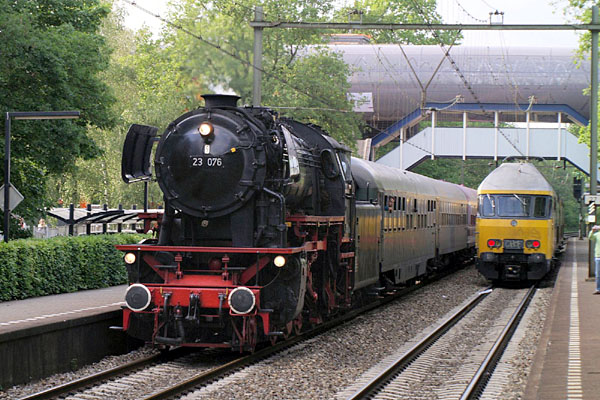 Hilversum Noord, 14 mei 2011. Een stoomtrein van de VSM als Grachten-Express op de terugweg van Amsterdam naar Duitsland. Zowel de oude als de nieuwe luchtbrug zijn hier goed te zien. Foto Jan Barnier. |