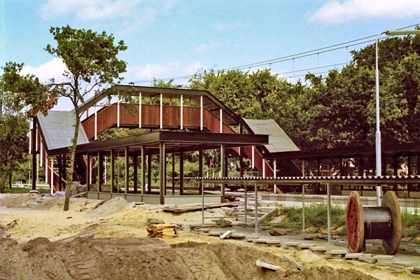 Hilversum NOS, 1974. Halte in aanbouw, de luchtbrug staat al op zijn plaats. Foto Henk Koster. |