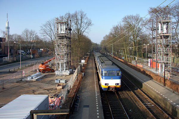 Hilversum, 29 januari 2011. Sprinters 2957 en 2137 passeren de plek waar de nieuwe traverse, met liften, zal komen. Gezien vanaf de oude luchtbrug. Links de zendtoren van Hilversum. Foto Henk Koster. |