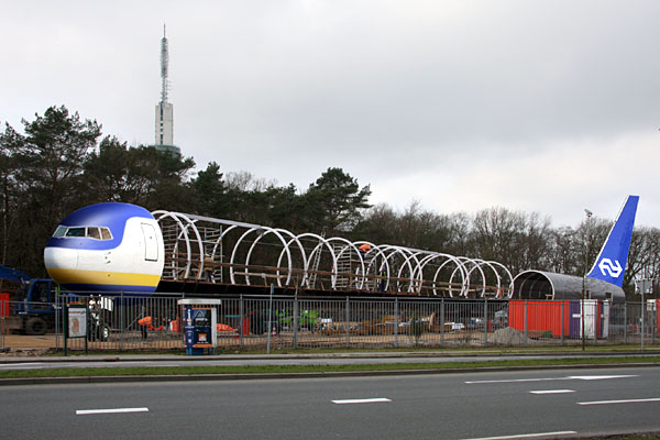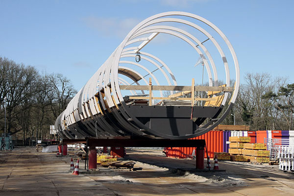 Hilversum, 7 februari 2011. De brug wordt gemonteerd op een bouwterrein bij de Mies Bouwman Boulevard. |