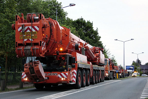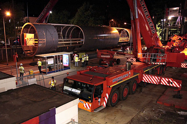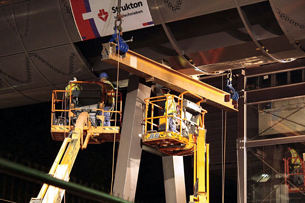 Hilversum, 8/9 mei 2011. 's Nachts wordt het eerste deel van de traverse op zijn plaats gehesen. Foto's Henk Koster. |