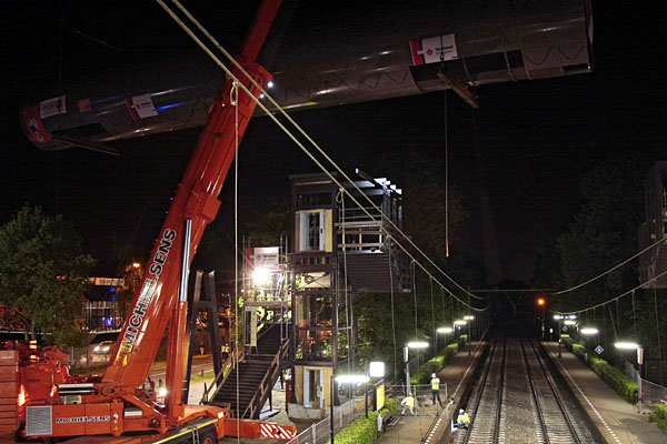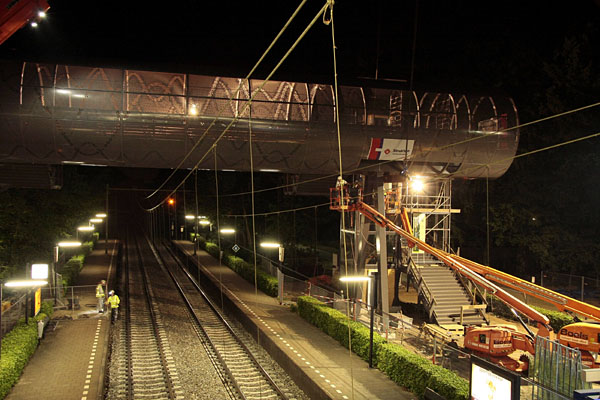 Hilversum Noord, 7 augustus 2011. De oude luchtbrug verdwijnt op passende wijze: door de lucht. Aan deze brug hing ook de bovenleiding, zodat er een nieuw bovenleidingportaal moest worden geïnstalleerd (linksonder op de foto). Foto Henk Koster. |
