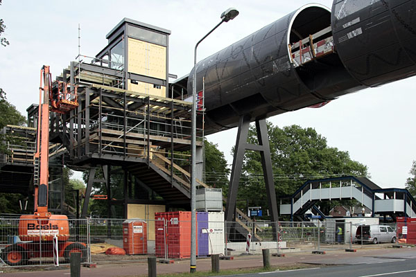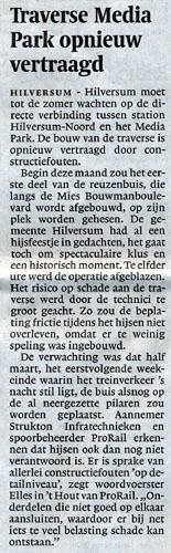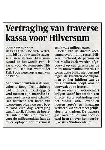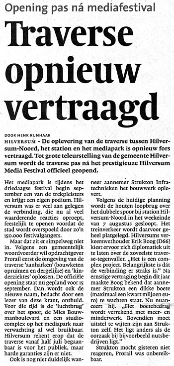 Gooi- & Eemlander, 24 juni 2011. De oplevering van de nieuwe traverse is opnieuw vertraagd. De officiële opening is nu gepland op 15 september. De oude loopbrug wordt gesloopt in het weekend van 7 augustus. |