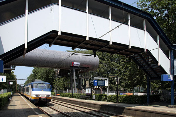 Nieuwe traverse Hilversum Noord (2011)In 2011 kreeg het station Hilversum Noord een rechtstreekse loopverbinding met het Mediapark. De traverse is met liften vanaf de perrons bereikbaar en vervangt de oude voetgangersbrug die de twee perrons verbond. Hieronder aandacht voor de aanleg van deze bijzondere traverse, die de naam "Kijkbuis" heeft gekregen. De halte zelf wordt eind 2012 omgedoopt tot "Hilversum Media Park". Met speciale dank aan Henk Koster voor zijn foto's en knipsels. |