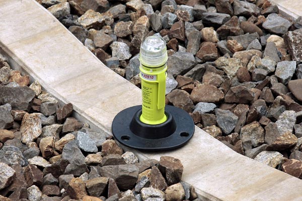 Tussen de rails stonden knipperende lampjes. Deze geven de grens aan van het werkgebied tijdens een buitendienststelling. Werknemers en machines mogen alleen in dit gebied komen met toestemming van de LWB (Leider WerkplekBeveiliging). Er zijn ook exemplaren met een blauw zwaailicht, die op de spoorstaaf worden geplaatst. Ook worden er weleens oranje pionnen gebruikt zoals we die kennen van werkzaamheden langs de weg. Foto Henk Koster. |
