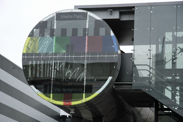 Hilversum, 11 juni 2011. Als bijnaam voor deze lange koker is de naam "De Verrekijker" geopperd. Dit is de naam van een jeugdprogramma uit de jaren vijftig, een soort voorloper van Het Klokhuis. Verrekijker is ook de letterlijke vertaling van het woord televisie. Bij de officiële opening in september 2011 werd de definitieve naam bekendgemaakt: "Kijkbuis". Foto/montage Henk Koster. |