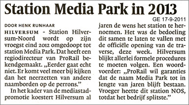 Eind 2012 krijgt de halte Hilversum Noord een nieuwe naam: na "Hilversum NOS" en "Hilversum Noord" wordt het dit keer "Hilversum Media Park". ProRail lijkt daar een beetje moeilijk over te doen. Knipsel uit de Gooi- en Eemlander, 17 september 2011. |