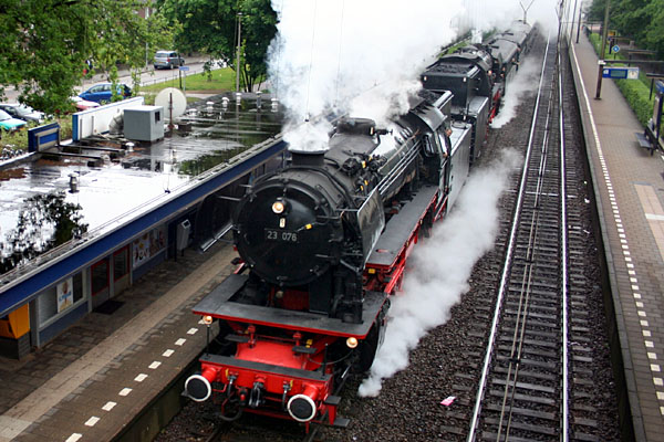 Hilversum Noord, 30 mei 2010. VSM-locs 23 076 en 23 071 met de Corus Expres op weg naar Beverwijk.