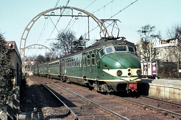 Hilversum Sportpark, 5 april 1969. Treinstel 720 op weg naar Hilversum.
