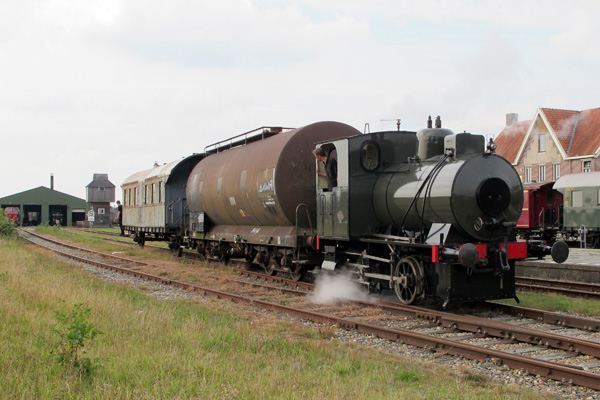 Stadskanaal, 26 augustus 2017. Vuurloze loc 6326 heeft tientallen jaren gastvrijheid genoten bij de SSN. Begin augustus is ze verhuisd naar de STAR. De loc, eigendom van een particulier, verblijft daar op basis van een langdurige bruikleenovereenkomst. Op 26 augustus werd ze officieel in gebruik genomen op haar nieuwe werkplek. Na een aantal korte ritten is ze de hele dag actief geweest op het emplacement van Stadskanaal. Het rangeerdeel op de foto was zwaarder dan je zou denken: de ketelwagen was gevuld met 40 kuub water. Foto Remmo Statius Muller. |