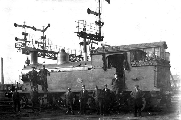 HSM-loc 775 op het rangeerterrein van Almelo. De foto moet van voor 1921 zijn daar de lok nog de nummerplaten heeft van de Hollandsche IJzeren Spoorweg-Maatschappij. De loc, in 1913 gebouwd door Werkspoor, heeft bij NS onder nummer 5705 gereden. De kolenbak zou later, net als bij de serie 5500, worden verhoogd. Foto collectie Hermann Hinsenveld. |