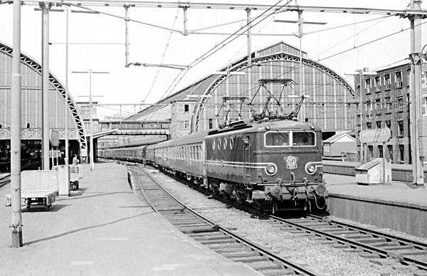 Amsterdam CS, 1963. Kort na het middaguur loopt een Frans TEE-treinstel binnen als TEE 103 "Ile de France" uit Parijs. Rechts is een treinstel mat.'40 te zien. Foto's Wietze Landman. |