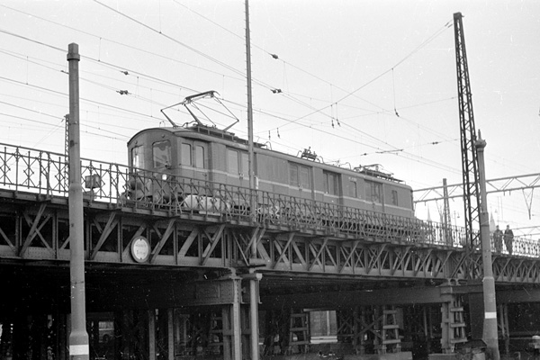 Amsterdam CS, 1963. Westelijk van het station, op het viaduct over de Droogbak, staat een motorpostrijtuig, een verbouwde Blokkendoosmotorwagen. Foto Wietze Landman. |