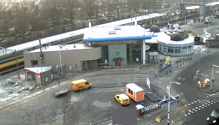 Assen, 1 maart 2016. Begin van de sloop van het station, een ontwerp van Rob Steenhuis. In de achtergrond de tijdelijke voetgangersbrug naar het perron. Foto via webcam www.bouwcam.com/cameras/station-assen