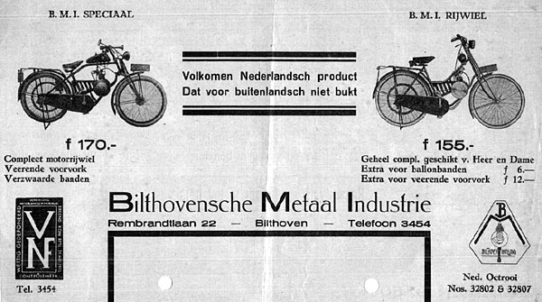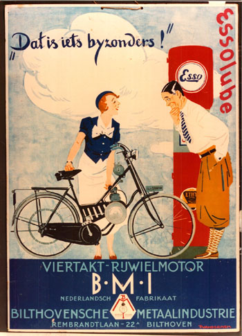 Affiche van de Bilthovensche Metaalindustrie (BMI). De fabriek, aan de Rembrandtlaan in Bilthoven, heeft slechts enkele jaren bestaan: van 1934 tot 1936. De BMI fabriceerde een door de heer Beyerman ontworpen motorblokje, dat voor verschillende doeleinden kon worden gebruikt. Voornamelijk fietsen, maar ook invalidenwagens en bootjes werden voorzien van een BMI-motor. In opdracht van NS zijn ook gemotoriseerde railfietsen gebouwd. Collectie C.B. Beyerman. |