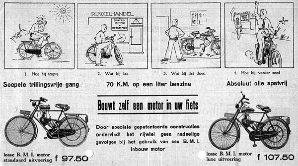 Een BMI-motor om in een bestaande fiets in te bouwen kostte ongeveer 100 gulden, maar er waren ook complete fietsen verkrijgbaar. Per verkochte motor moest BMI 2 gulden afdragen aan Stork, omdat de heer Beyerman de motor had ontworpen toen hij in dienst was van Stork. In 1934 nam hij ontslag en stichtte hij met een compagnon een eigen bedrijf. Twee jaar later werd de fabriek weer gesloten. De naam BMI werd verkocht aan een ander bedrijf. Collectie C.B. Beyerman. |