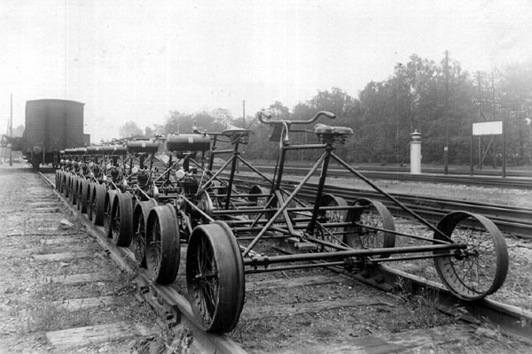 Bilthoven, tussen 1934 en 1936. Nieuwe railfietsen op het terrein van de Bilthovensche Metaalindustrie (BMI). |