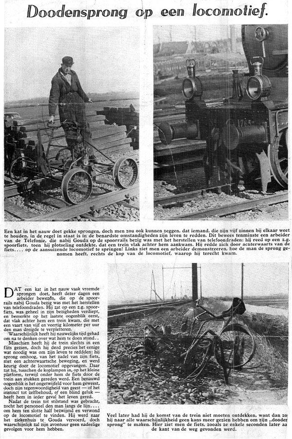 "Doodensprong op een locomotief". Artikel uit een onbekend blad, jaren 40, waarin wordt beschreven hoe een arbeider op een spoorfiets aan de dood ontsnapte door op de locomotief te springen die hem van achteren aanreed. Ter illustratie is een foto afgedrukt van een opzichter op een railfiets bij de stapelplaats Crailoo. |