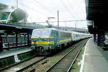 Aachen Hbf, 15 juli 1997. NMBS-loc 1601 in Märklin-beschildering, met een trein van Köln naar Oostende. |