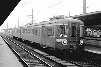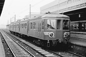 Amsterdam CS, 24 september 1969. NMBS-treinstel 220.902 in een trein naar Brussel. Deze Beneluxstellen waren afgeleid van de Nederlandse Hondekoppen. Zowel de NMBS als de NS bezaten er een aantal. Jarenlang verzorgden deze treinstellen de dienst tussen Amsterdam en Brussel, via Rotterdam en Antwerpen. Het treinstel op deze foto is bewaard gebleven. Klik hier voor meer Beneluxtreinen. |