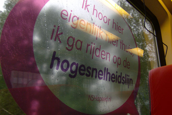 Tussen Roosendaal en Antwerpen, 7 mei 2007. Vanuit mijn raampje zat ik tegen deze sticker aan te kijken. Ik zat in een Benelux-rijtuig dat vrolijk bestickerd is, om straks dienst te gaan doen op onze nieuwe nationale trots: de HSL Zuid. Dat was natuurlijk niet de bedoeling, dat van die rijtuigen, want die mogen maar 160 km/uur, maar dat komt omdat men de nieuwe treinstellen te laat heeft besteld. (Terwille van de leesbaarheid heb ik deze foto gespiegeld.) |