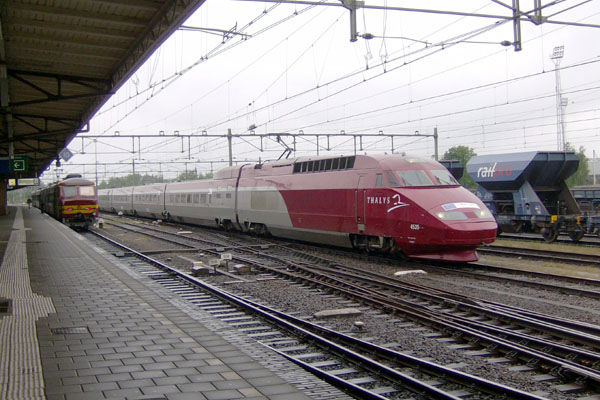 Roosendaal, 7 mei 2007. Links de boemeldienst Roosendaal-Antwerpen, die één keer per uur rijdt en slecht aansluit op de Nederlandse dienstregeling. Rechts een TGV die op bromfietssnelheid het station passeert. De HSL zal straks Roosendaal links laten liggen (of rechts als de trein uit Amsterdam komt), terwijl de Beneluxdienst wordt afgeschaft. Wie dan nog zonder extra toeslag naar België wil, zal het boemeltje moeten nemen. Maar misschien schaffen ze dat ook wel af. |