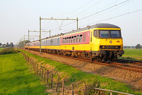 Moordrecht, 5 september 2005. Wegens een draadbreuk tussen Den Haag en Leiden werden deze Beneluxtreinen omgeleid via Breukelen, Gouda en Rotterdam. Foto's Leen Dortwegt. |