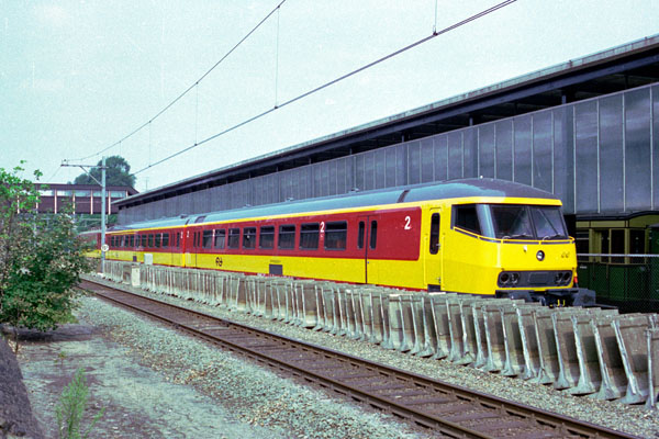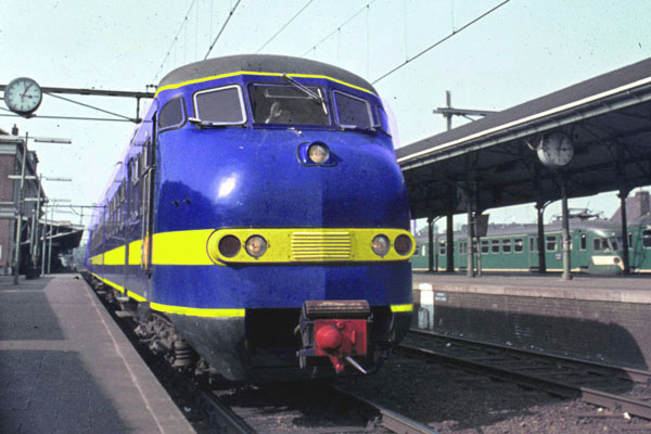 Het had gekund. Er is tussen NS en NMBS ooit gesproken over een vervolgserie Benelux-treinstellen, gebaseerd op het ontwerp van Plan V. Wel met lage koppelingen, zodat ze gecombineerd zouden kunnen rijden met de oudere stellen. In plaats van nieuwbouw koos men voor het gebruik van bestaand materieel, om daarmee trek-duwtreinen samen te stellen. (Foto: Hilversum, 8 september 1969, treinstel 525.) |