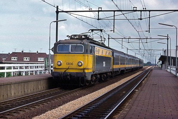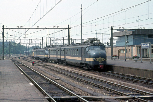 Dordrecht, 26 september 1986. Beneluxtrein IC 189 op weg naar Amsterdam. De trein is samengesteld zoals het hoorde, en wordt geduwd door loc 2553. Foto Rob van der Rest. |