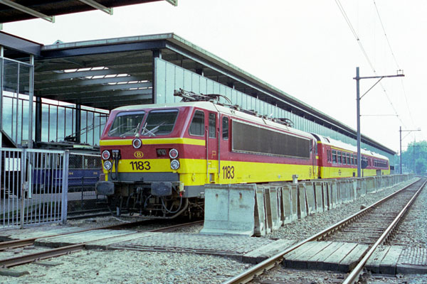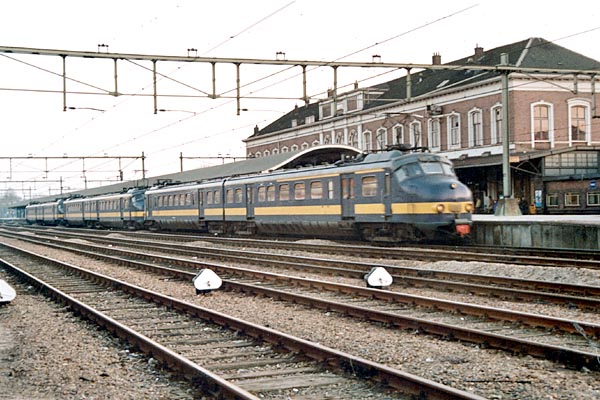 Schiphol, 10 januari 1987. Het is bijna gebeurd met de Beneluxstellen en de oude trek-duwtreinen. De nieuwe Beneluxtreinen nemen het roer over. Deze trein is op weg naar Brussel. |