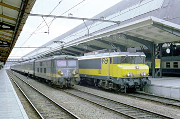 Amsterdam CS, 10 januari 1987. Locs NMBS 2554 en 2555 met een stam oude Beneluxrijtuigen als "trek-trektrein". Deze locs zouden jaren later nog een poosje dienstdoen bij Lovers Rail. |